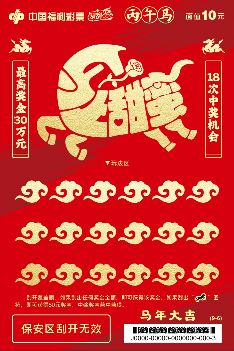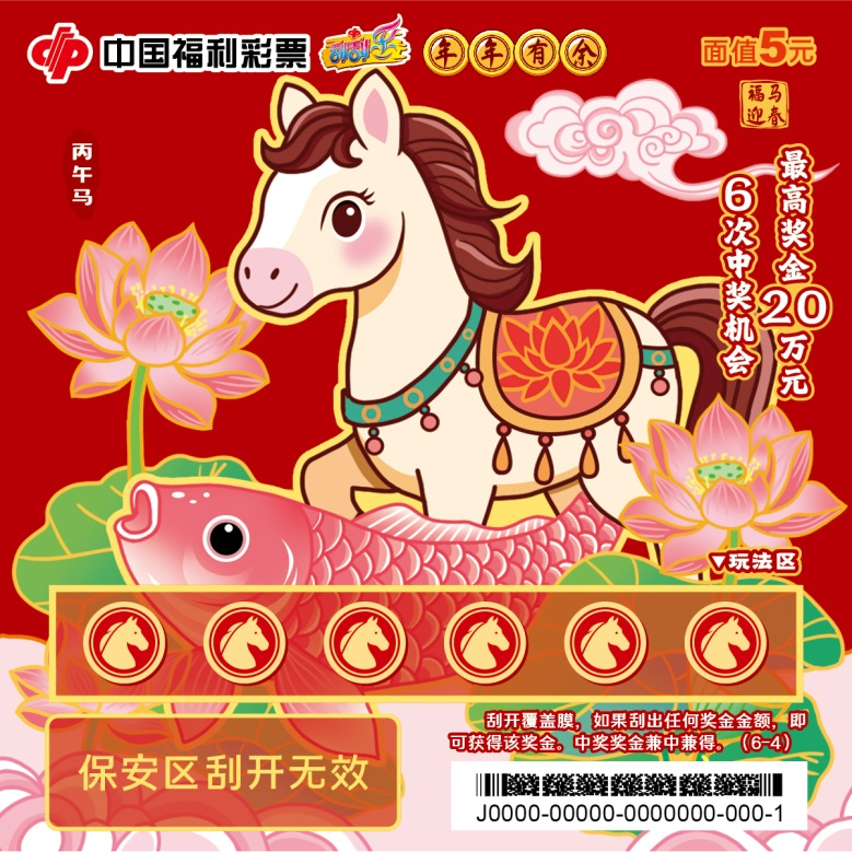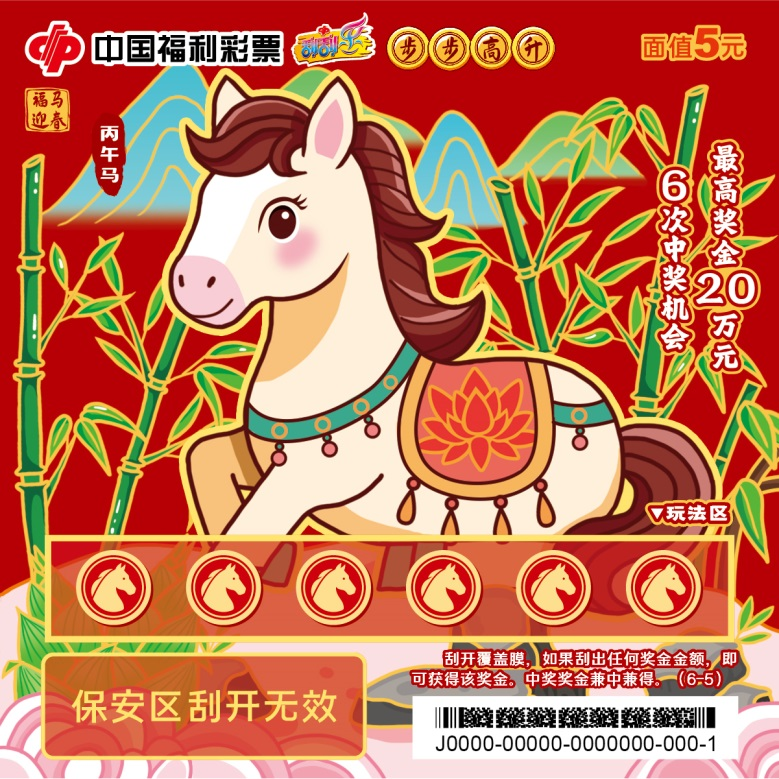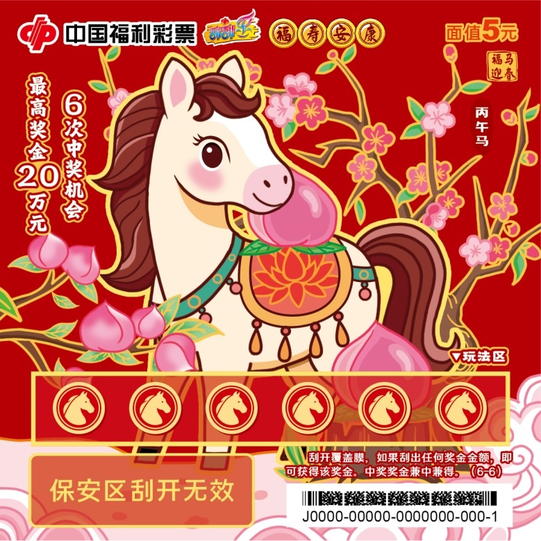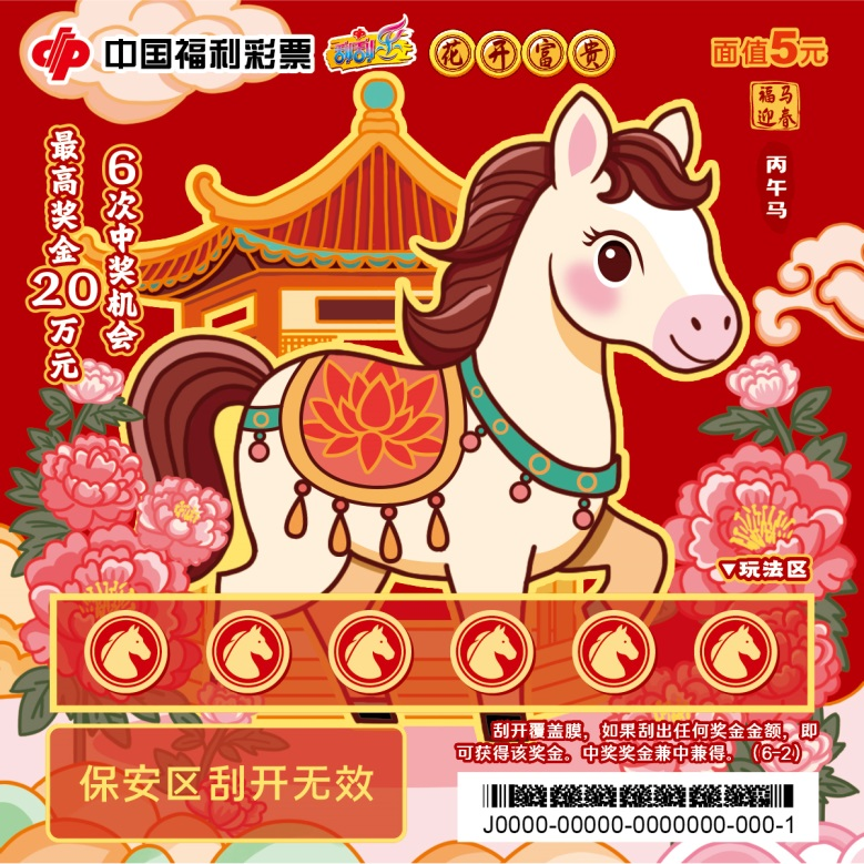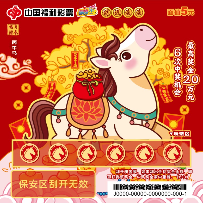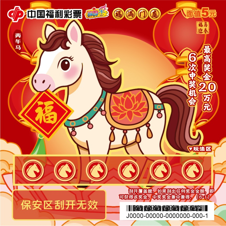 六张票面分别以福满门庭、花开富贵、财源滚滚、年年有余、步步高升、福寿安康为主题,憨态可掬的“福马”形象传递新春暖意。刮开覆盖膜,如果刮出任何奖金金额,即可获得该奖金。中奖奖金兼中兼得。最高奖金20万元,共6次中奖机会。