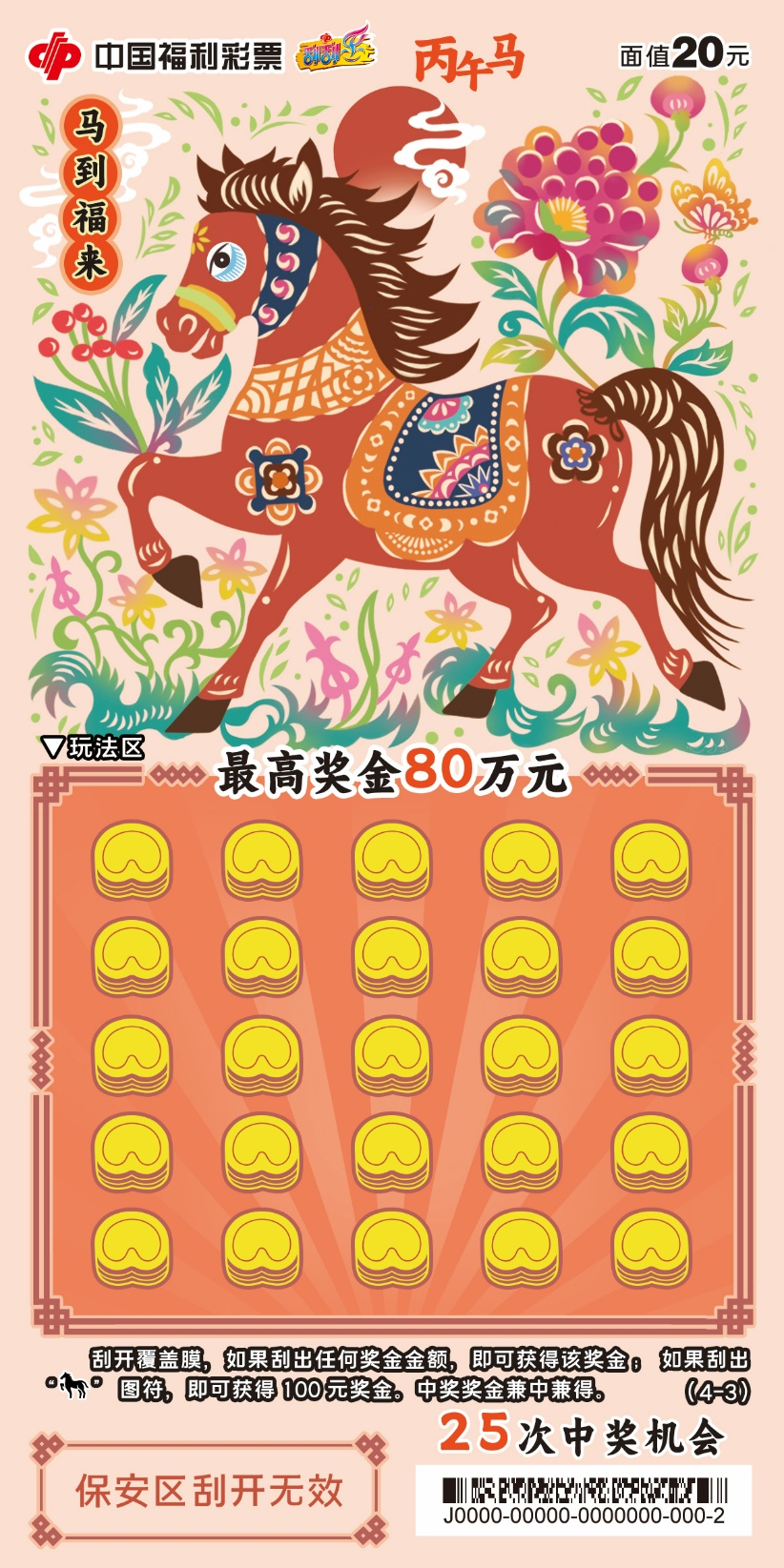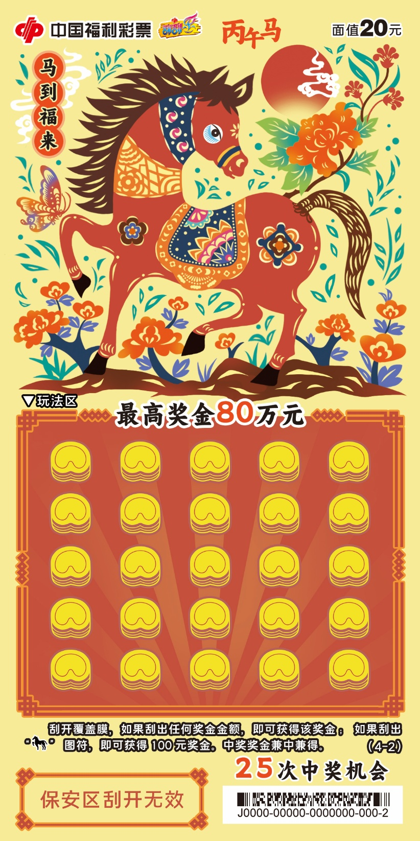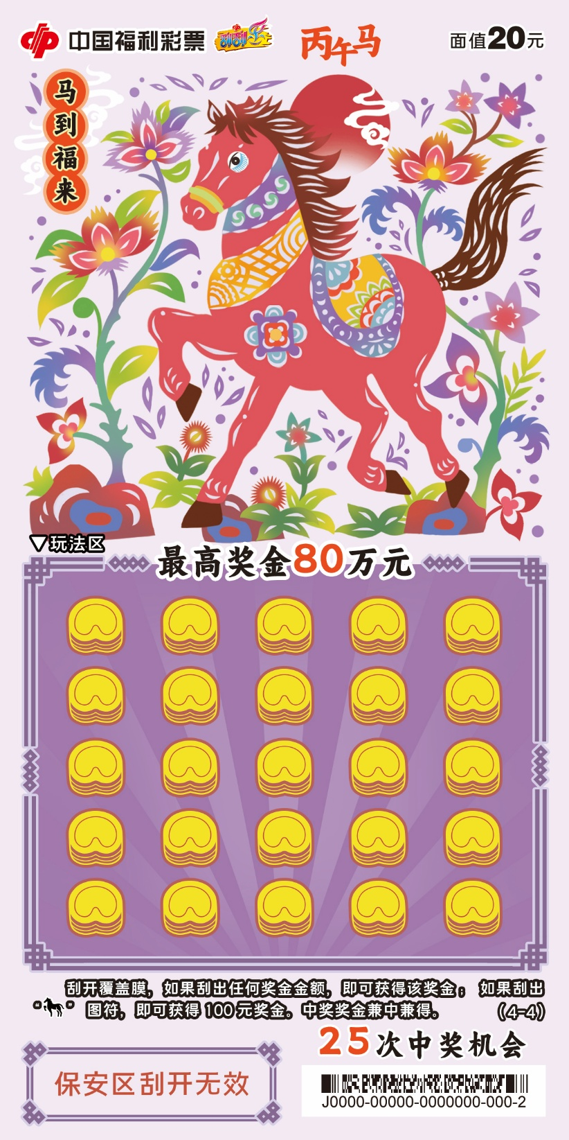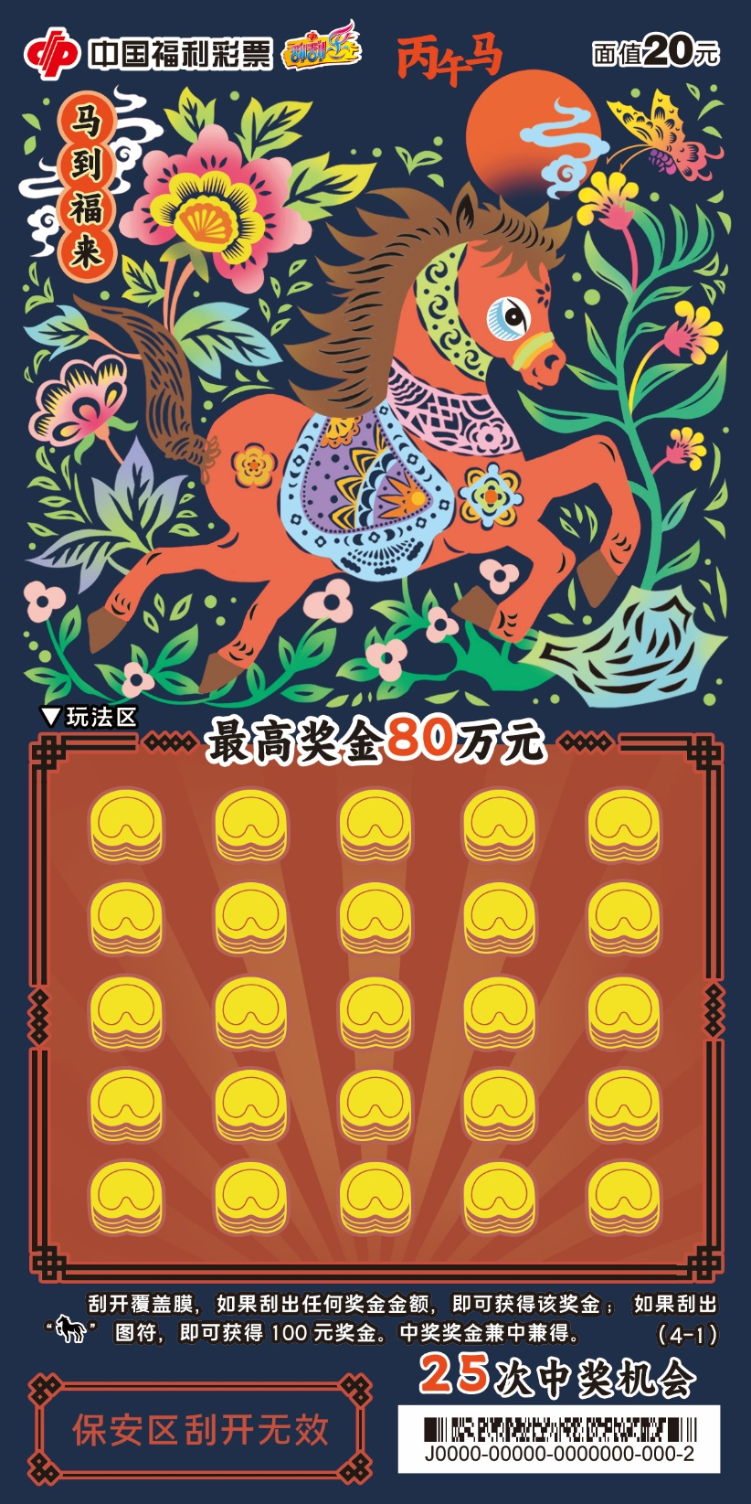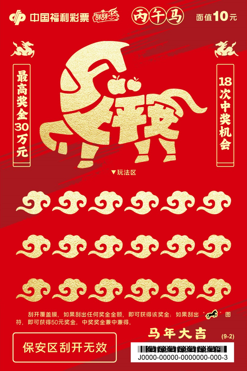 四张票面色彩明快,融入非遗剪纸技艺,镂空线条勾勒骏马奔腾之姿。刮开覆盖膜,如果刮出任何奖金金额,即可获得该奖金;如果刮出“骏马”图符,即可获得100元奖金。中奖奖金兼中兼得。最高奖金80万元,共25次中奖机会。