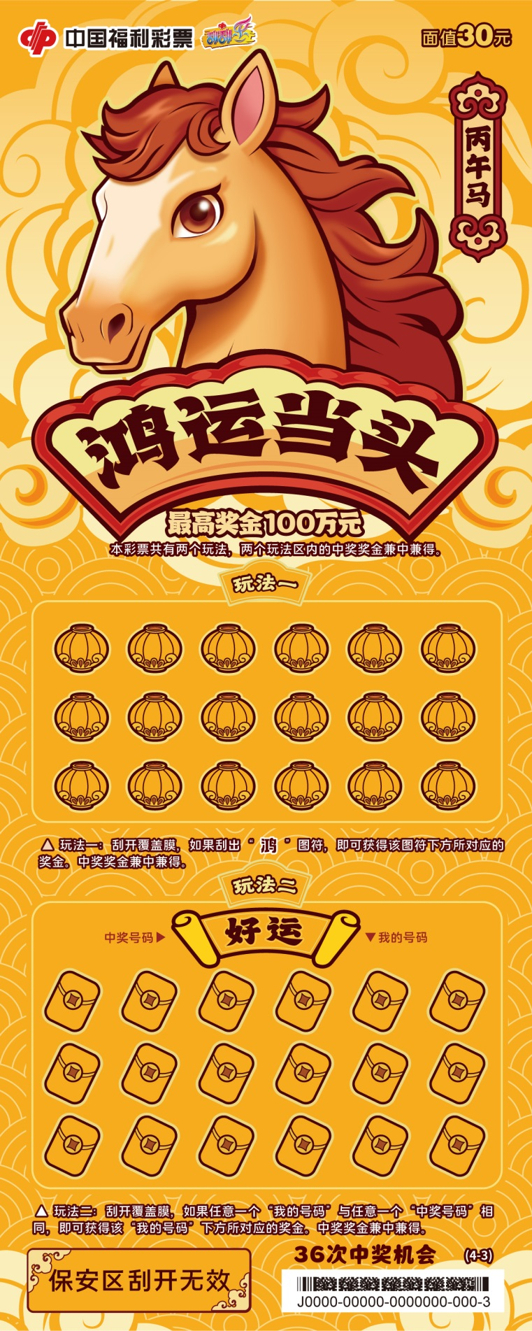 票面以红金为主色调,骏马奔驰画面气势恢宏,象征以昂扬姿态迎接新年的勃勃生机。最高奖金100万元,共50次中奖机会。